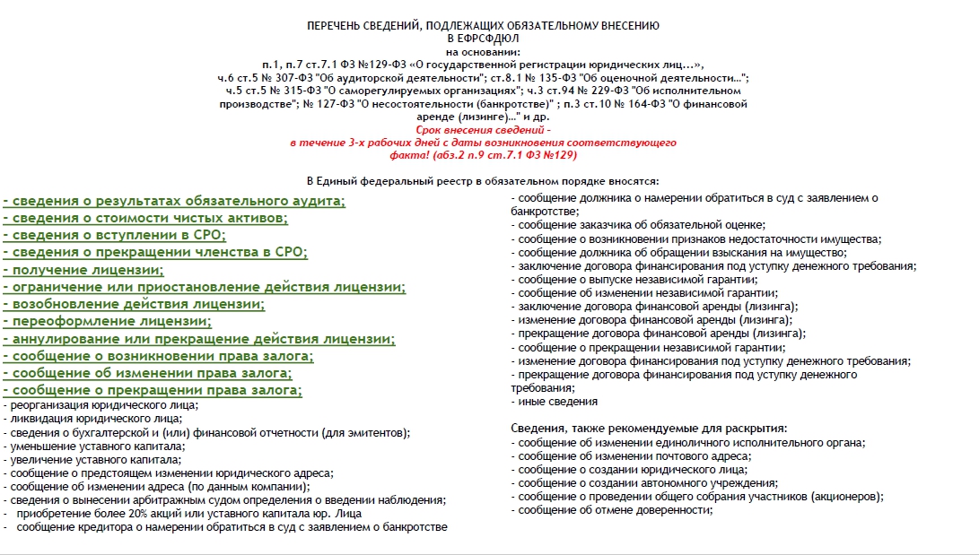 Можно предположить, что из-за отсутствия штрафных санкций..? Но это не так. Штрафные санкции присутствуют согласно части 6;7;8 статьи 14.25 «Кодекс Российской Федерации об административных правонарушениях» от 30.12.2001 № 195-ФЗ. Может тогда из-за существующего мнения, что внесение сведений является обязанностью уполномоченного федерального органа исполнительной власти, осуществляющего государственную регистрацию юридических лиц? Но это тоже не верно! В пункте 8 статьи 7.1 Федеральный закон от 08.08.2001 г. № 129-ФЗ «О государственной регистрации юридических лиц и индивидуальных предпринимателей» перечислены пункты, сведения в которых вносит в Федресурс федеральный орган исполнительной власти, осуществляющий государственную регистрацию юридических лиц. Сведения, указанные в подпунктах «к» – «п» пункта 7 статьей 7.1 Федерального закона от 8 августа 2001 г. N 129-ФЗ «О государственной регистрации юридических лиц и индивидуальных предпринимателей» подлежат внесению в Единый федеральный реестр сведений о фактах деятельности юридических лиц самостоятельно.